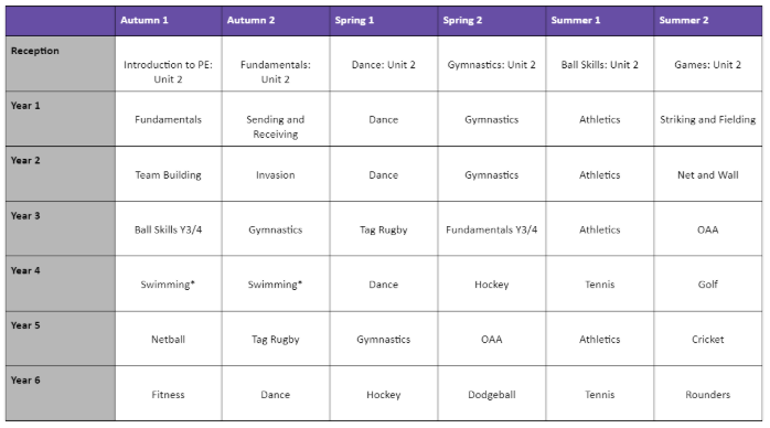 Swimming will take place in Y4 (Autumn), with top-up* swimming occurring in the final term for Y6.
